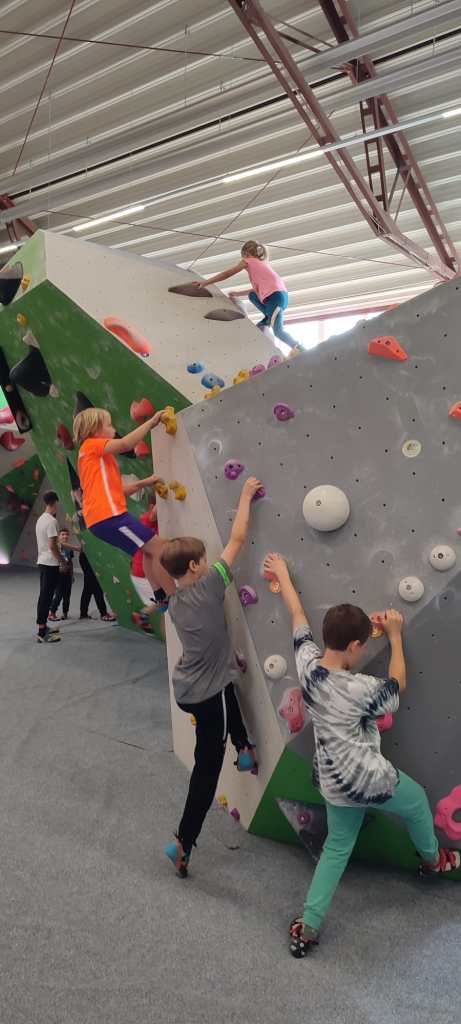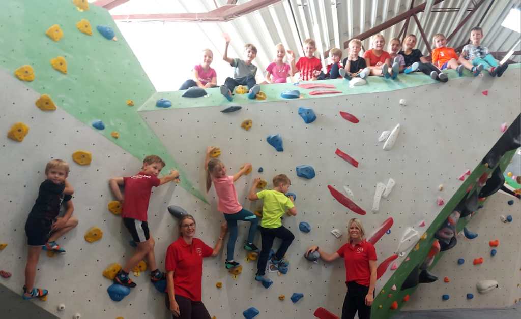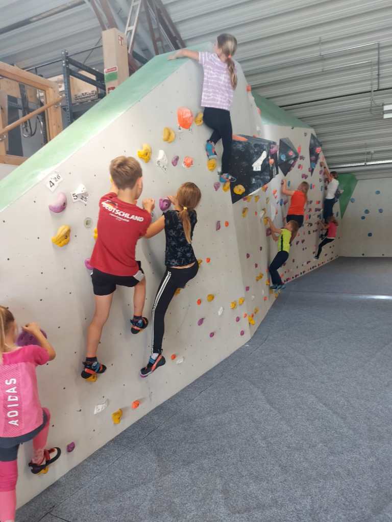Nach der Begrüßung und dem Anprobieren der Schuhe ging es auch schon gleich in die große Halle. Hier wurden den Kindern durch die zwei Trainer der Boulderhalle die Hallenregeln erklärt. Dann ging es los: erst mal aufwärmen mit verschiedenen Spielen wie es sich gehört für gute Sportler, dann erst mal das Abrollen üben und natürlich die ersten kleinen Boulderrouten ausprobieren. Immer mehr Routen wurden in Angriff genommen, die ganze Halle wurde inspiziert und immer höher ging es hinauf. Viele trauten sich bis ganz nach oben, andere hielten sich lieber in Bodennähe auf, jeder wie er wollte. Für jeden waren genug Routen in der entsprechenden Schwierigkeitsstufe vorhanden um sich richtig auszupowern. Zum Ausklang des Ferienprogramms gingen einige noch in den Kinderbereich zum freien Toben, andere spielten noch einmal das Buchstabenspiel im Aufwärmbereich.
