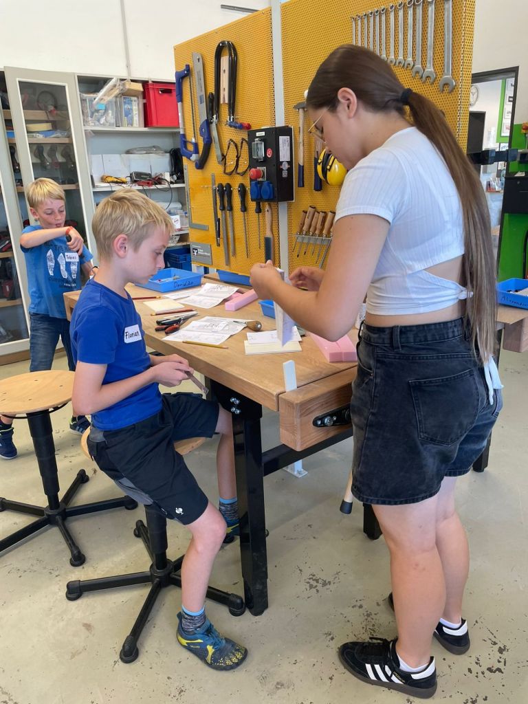 Dort wartete bereits Werkstattleiter Andreas Müller gemeinsam mit Jung-Mentorin Michaela Müller. Unter ihrer Anleitung konnten die Kinder – ganz nach dem Motto „Wir bauen einen Elektro-Katamaran“ – tüfteln, schrauben und kreativ gestalten. 🎊